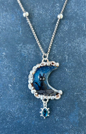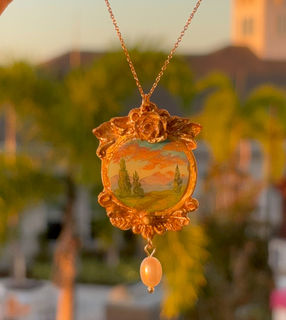 Included in the works I am submitting are jewelry pieces that are hand sculpted with polymer clay and hand painted using acrylic paint. I put them on a 14k gold chain and add a charm with different stones, from opals, to topaz and peridot.